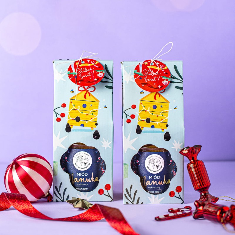 Szukasz wyjątkowego prezentu pod choinkę? Wybierz Miód Manuka prosto z Nowej Zelandii! To niewątpliwie najsłynniejszy miód świata - a znany jest ze swoich wyjątkowych właściwości. Najważniejszą jego cechą jest wysoka zawartość metyloglioksalu, w skrócie MGO. Nasze miody mają go aż 250+ lub 500+! Wybierz ten, który najlepiej Ci odpowiada, a my zapakujemy go w piękny kartonik ze świąteczną ilustracją i ozdobimy zawieszką z życzeniami Słodkich Świąt!